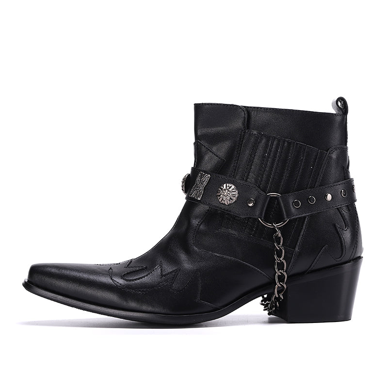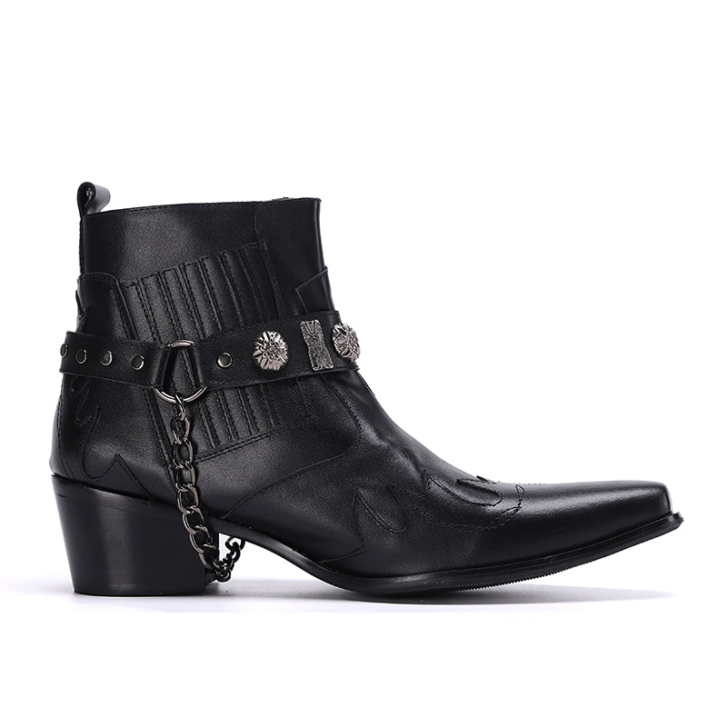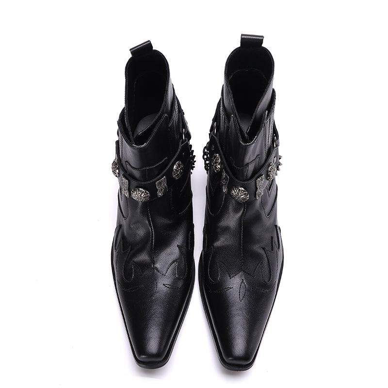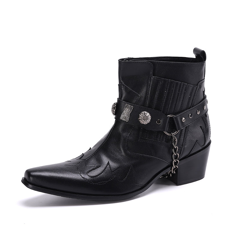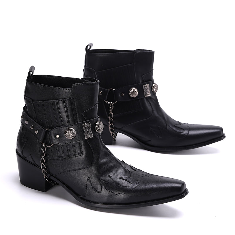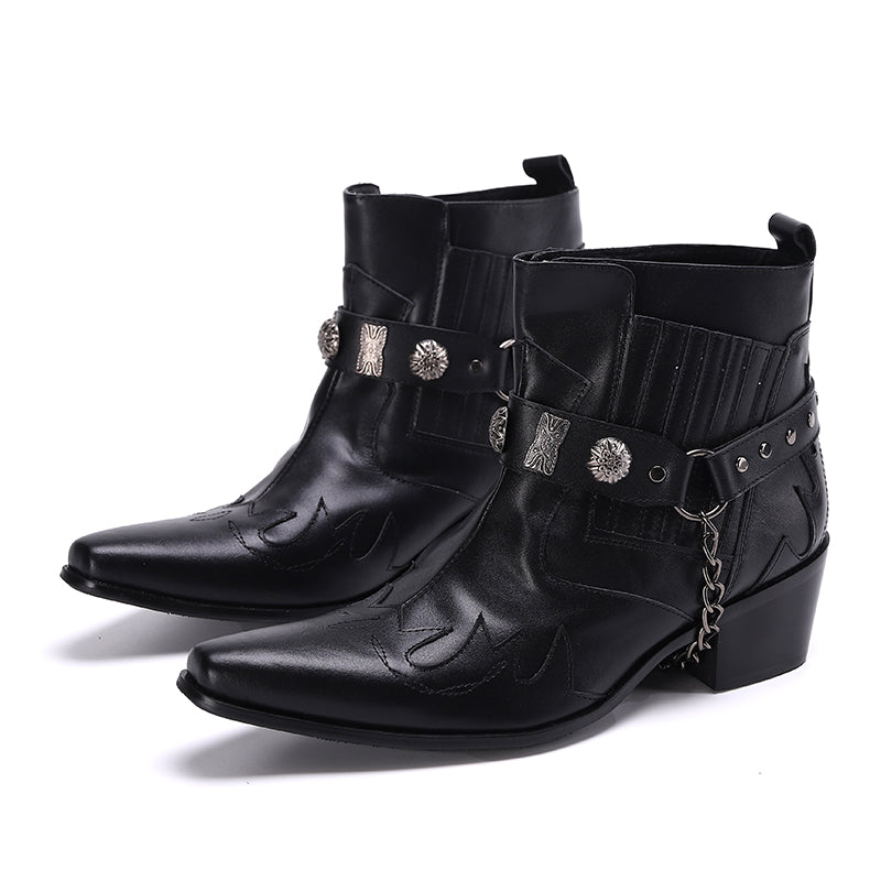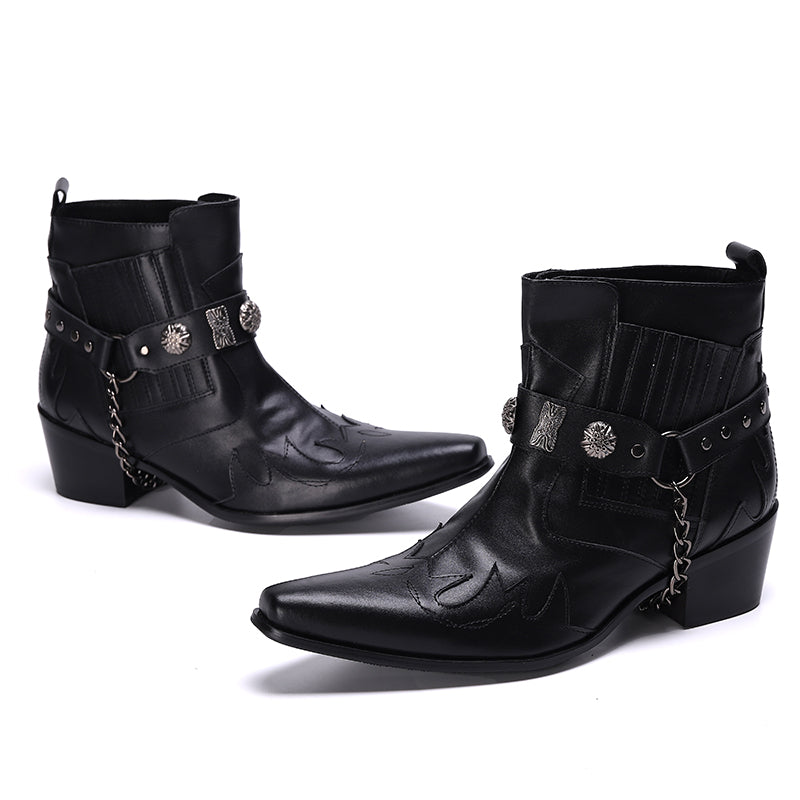 Step out in utmost style by sporting these appealing slip-on?Party Chelsea Boot with a PUNK?pattern. The leather made brogues for men have a pointed toe shape and have been made using genuine leather material. The full grain leather insole and lining will offer you comfort while the durable rubber outsole takes care of your comfort.